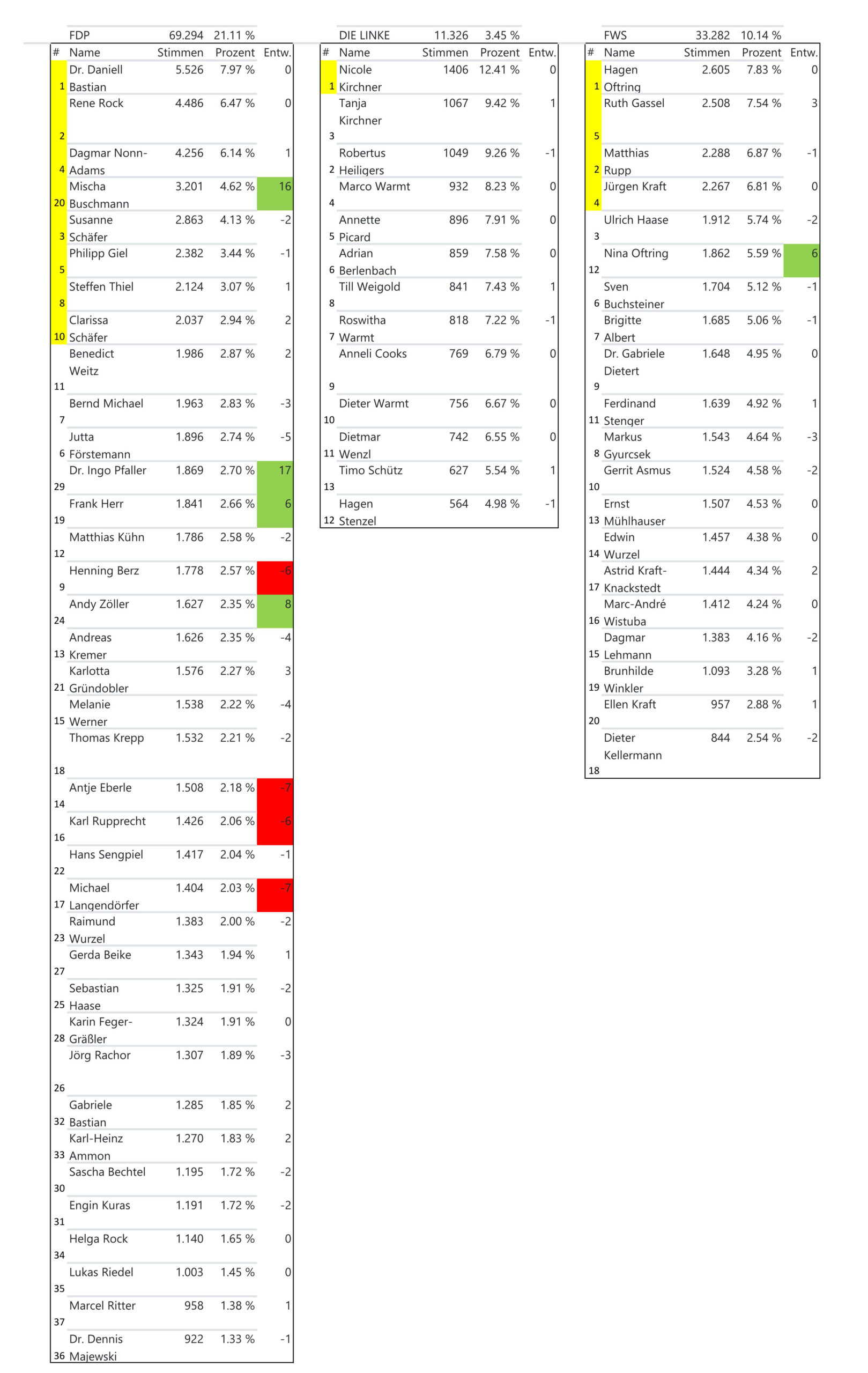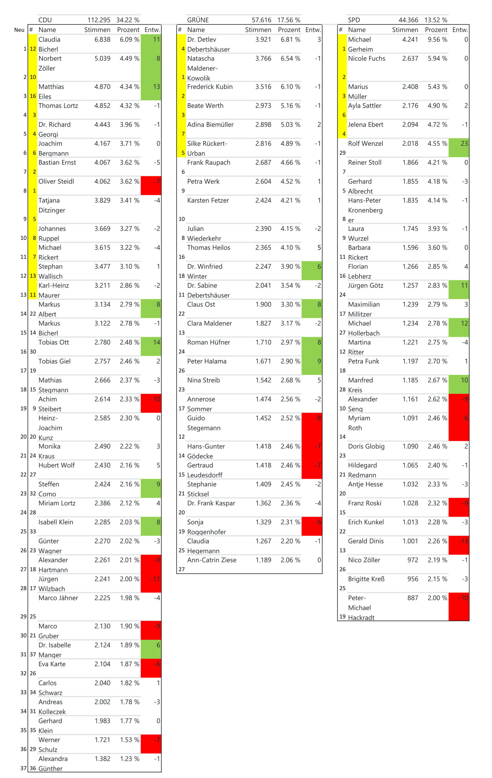 Die Tabellen zeigen, dass die Seligenstädterinnen und Seligenstädter fleißig kummuliert und panaschiert haben. So hat sich insbesondere bei der CDU die Reihenfolge an der Spitze deutlich verändert, u.a. mit der ehemaligen Stadträtin Claudia Bicherl.