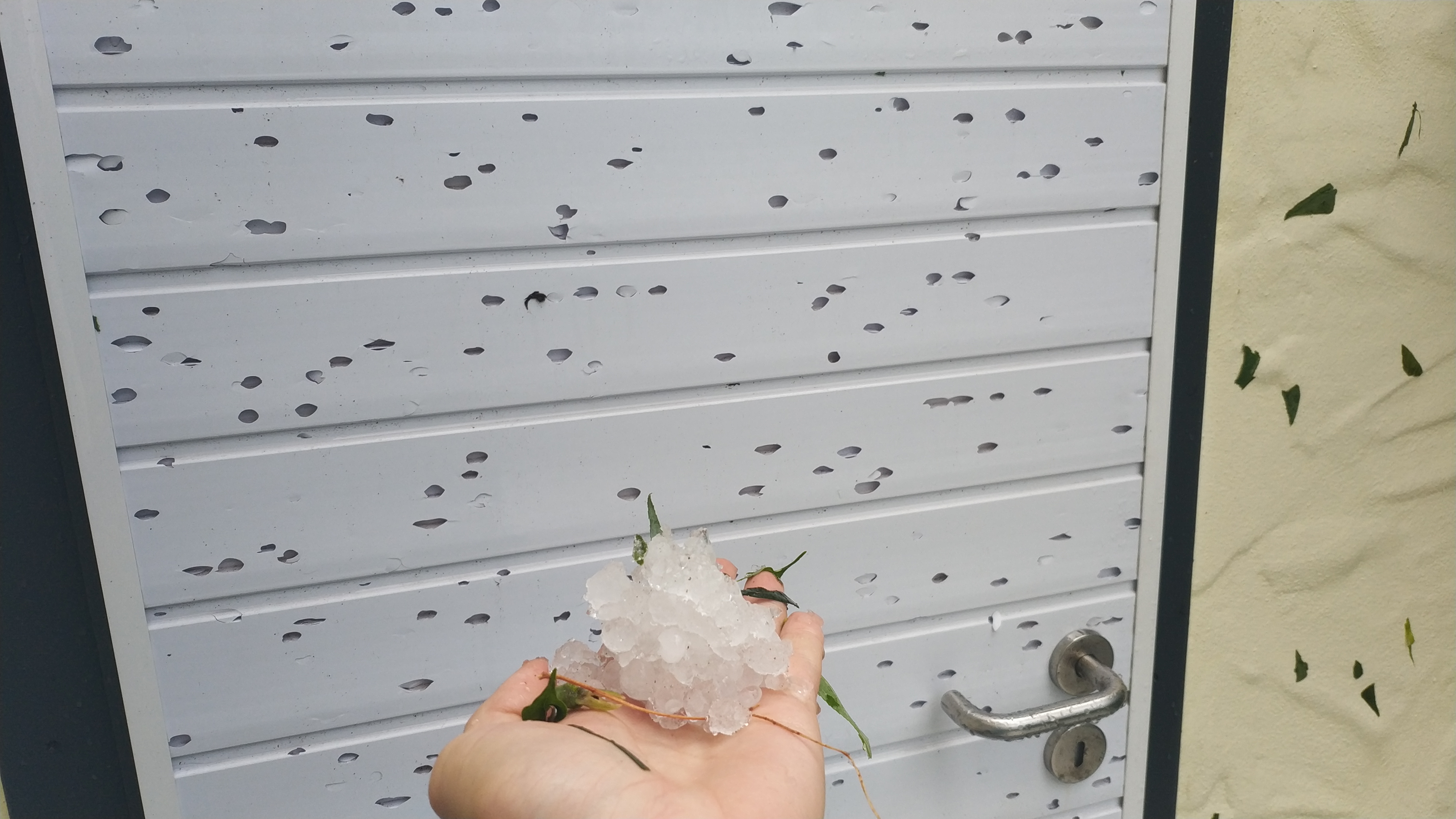 Löcher in der Tür, Hagelkörner in der Hand: Innerhalb kürzester Zeit haben die harten Flocken großen Schaden angerichtet.