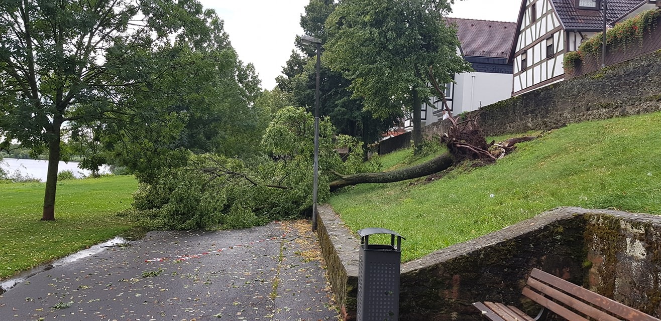 Ein schweres Gewitter mit Fallböen und Hagelkörnern zog gestern über den Kreis Offenbach. Schwere Schäden sind in Seligenstadt und dem Ortsteil Froschhausen entstanden. An mehreren Häusern flogen Ziegeln vom Dach auf die Straße, Keller liefen voll und mussten ausgepumpt werden und der Verkehr kam teilweise durch eingestürzte Bäume zum erliegen. Dabei dauerte das Gewitter selbst nur wenige Minuten.